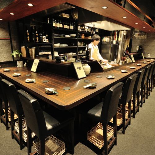 【居心地の良い空間】落ち着いたシックな内装が魅力の一階は、デートや特別な日の利用に最適です。カウンター席からは、シェフの調理風景を目の前で楽しめ、ライブ感あふれる食体験が味わえます。おひとり様でも気軽に訪問できる雰囲気で、最大6名様まで座れる掘りごたつも完備。団体様でもお気軽にご利用いただけます。